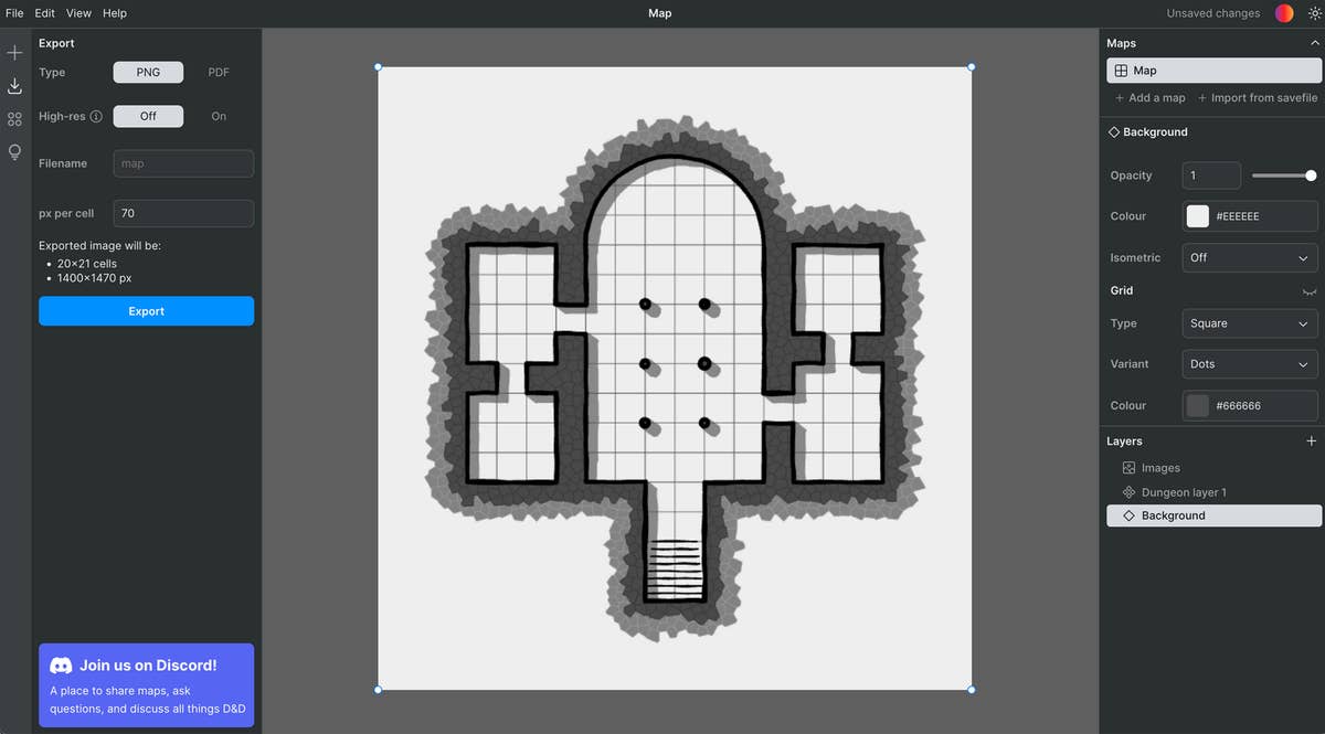 Dungeon maps for RPG. Create maps online, download as PDF and PNG.